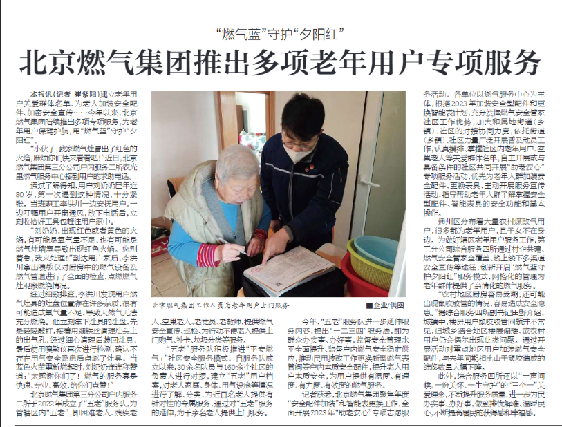 通州区分布着大量农村煤改气用户,很多都为老年用户,且子女不在身边。为做好辖区老年用户服务工作,第三分公司综合服务四所通过村企共建、燃气安全管家全覆盖、线上线下多渠道安全宣传等途径,创新开启“燃气蓝守护夕阳红”服务模式,网格化的管理为老年群体提供了亲情化的燃气服务。