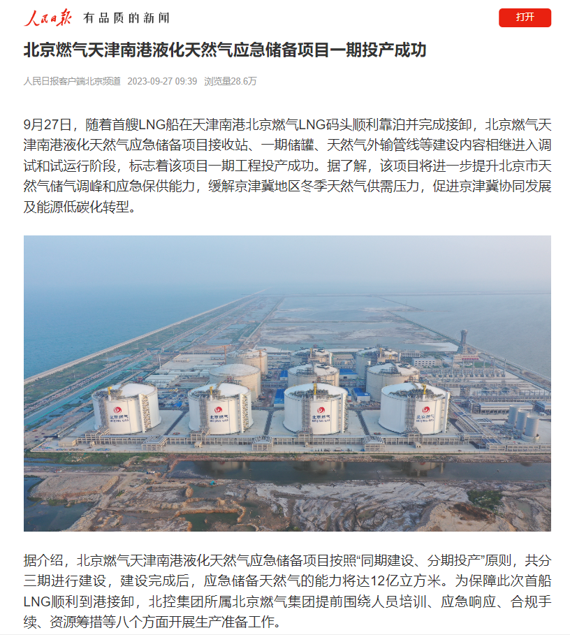 据介绍,北京燃气天津南港液化天然气应急储备项目,于2020年1月9日取得国家发改委核准批复。一期工程于2020年3月24日正式开工建设,于2022年底机械完工。随着项目一期工程投产成功,将大大提高京津冀地区天然气应急调峰和供应保障能力,为京津冀地区优化能源结构,发展低碳经济提供清洁能源保障。
