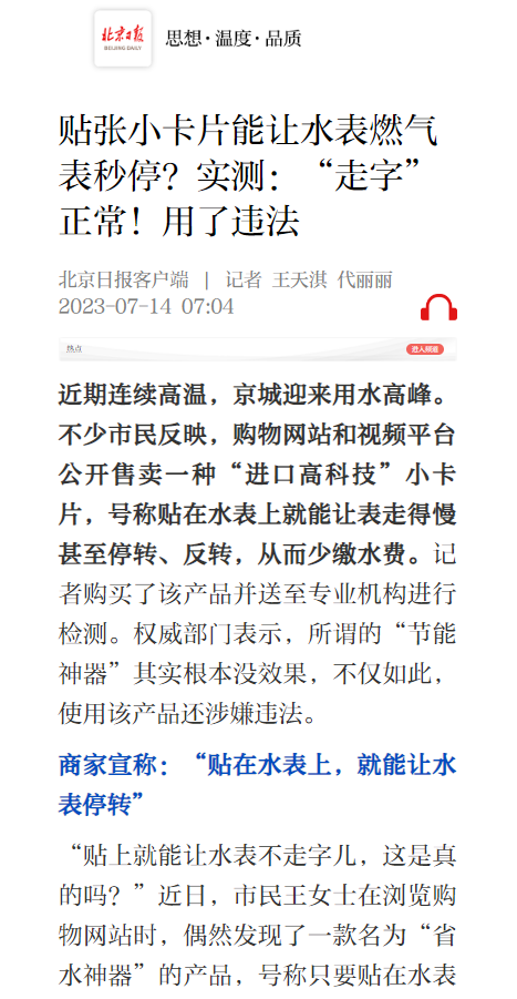 近期连续高温,京城迎来用水高峰。不少市民反映,购物网站和视频平台公开售卖一种“进口高科技”小卡片,号称贴在水表上就能让表走得慢甚至停转、反转,从而少缴水费。记者购买了该产品并送至专业机构进行检测。权威部门表示,所谓的“节能神器”其实根本没效果,不仅如此,使用该产品还涉嫌违法。